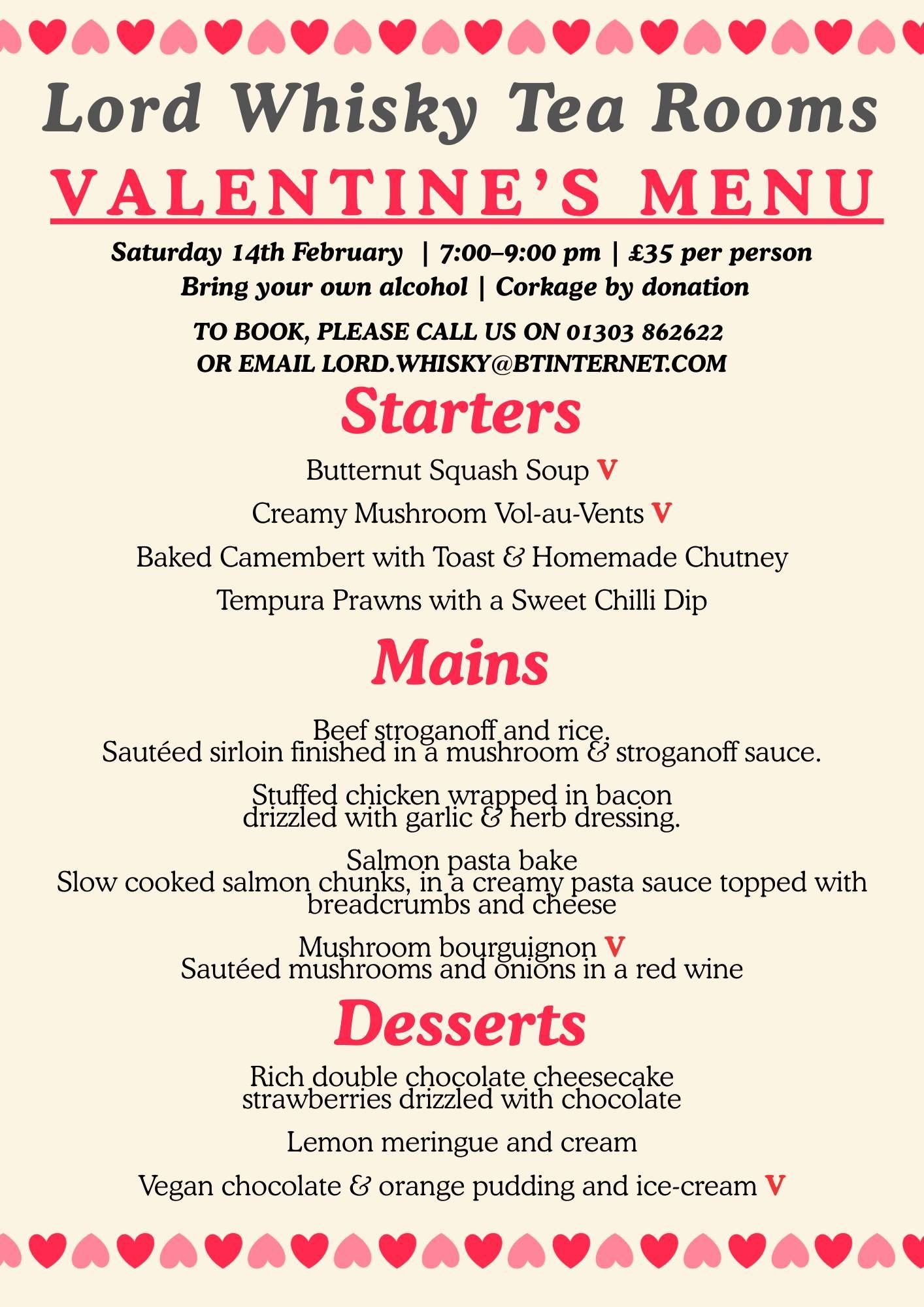 Valentine's Day 2026 is fast approaching. Why not treat your loved one to a meal at Lord Whisky Tea Rooms. Choose from the delicious options on the menu below, and perhaps bring along your own bottle of wine or champagne to make the evening extra special.