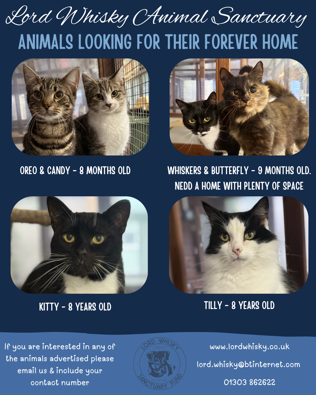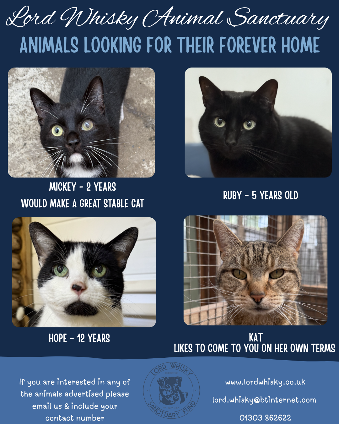 To adopt a cat, call The Lord Whisky Sanctuary Fund on 01303 862622